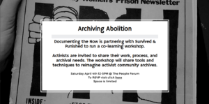 Eventbrite Link: https://www.eventbrite.com/e/free-survivors-issue-3-launch-tickets-97329881295 The People’s Forum 320 West 37th Street New York, NY 10018 12:00 PM – 5:00 PM EDT Survived & Punished NY is partnering with Documenting the Now to run a co-learning workshop. Activists are invited to share their work, process, and archival needs. The workshop will share tools and techniques and imagine … Continue reading April 4, 2020 | Archiving Abolition