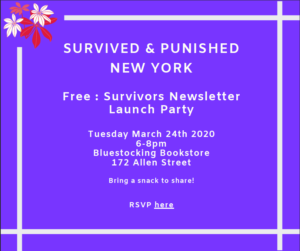Eventbrite Link: https://www.eventbrite.com/e/free-survivors-issue-3-launch-tickets-97329881295 Join the NY affiliate of Survived and Punished to celebrate our launch of Free:Survivors issue #3 — an official newsletter for comrades inside and outside! We’ll have copies of issue #3 of Free:Survivors for sale, with all proceeds going toward getting copies to comrades who are currently incarcerated and toward creating our … Continue reading March 24, 2020 | Free: Survivors Issue #3 Launch